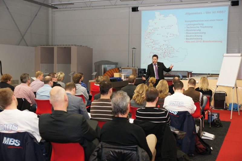 Das MBS Ausbildungs- und Schulungszentrum ist zugleich Showroom zur Demonstration der wichtigsten, zerstörungsfreien Trocknungsmethoden. In den MBS Räumen befindet sich ein komplettes Hausmodell mit zahlreichen, realistisch aufgebauten Verfahren inkl. der dazu nötigen Geräte und Zubehörteile. Der Wasserschadensimulator ermöglicht Training oder Demonstration praxisnaher Leckageortung. Hier ist, selbst für den Laien, anschaulich dargestellt, wie rationell unterschiedliche Wasserschäden abgewickelt werden können.